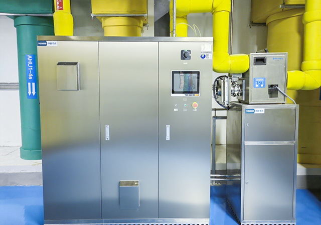 The system comprises a VHP generator, concentration control system, temperature/humidity regulation modules, ventilation equipment, and pipeline distribution networks. Based on the specific layout and HVAC configuration of the Enshi CDC P3 Laboratory, the VHP generator was installed in a dedicated equipment room adjacent to the AHU machinery space. Stainless steel pipelines connect the generator to the HVAC supply ducts, ensuring uniform distribution of VHP vapor throughout the entire air handling system.